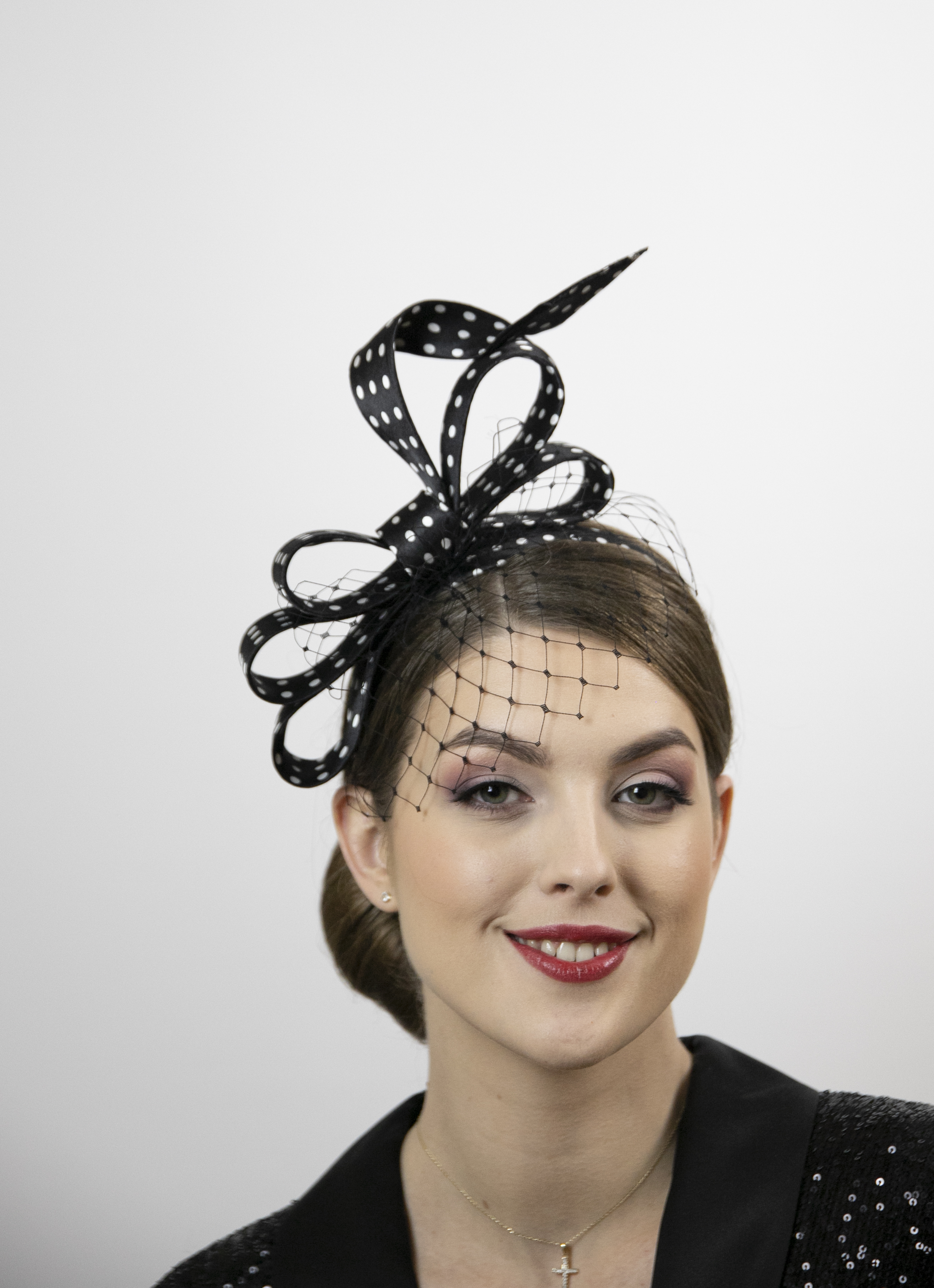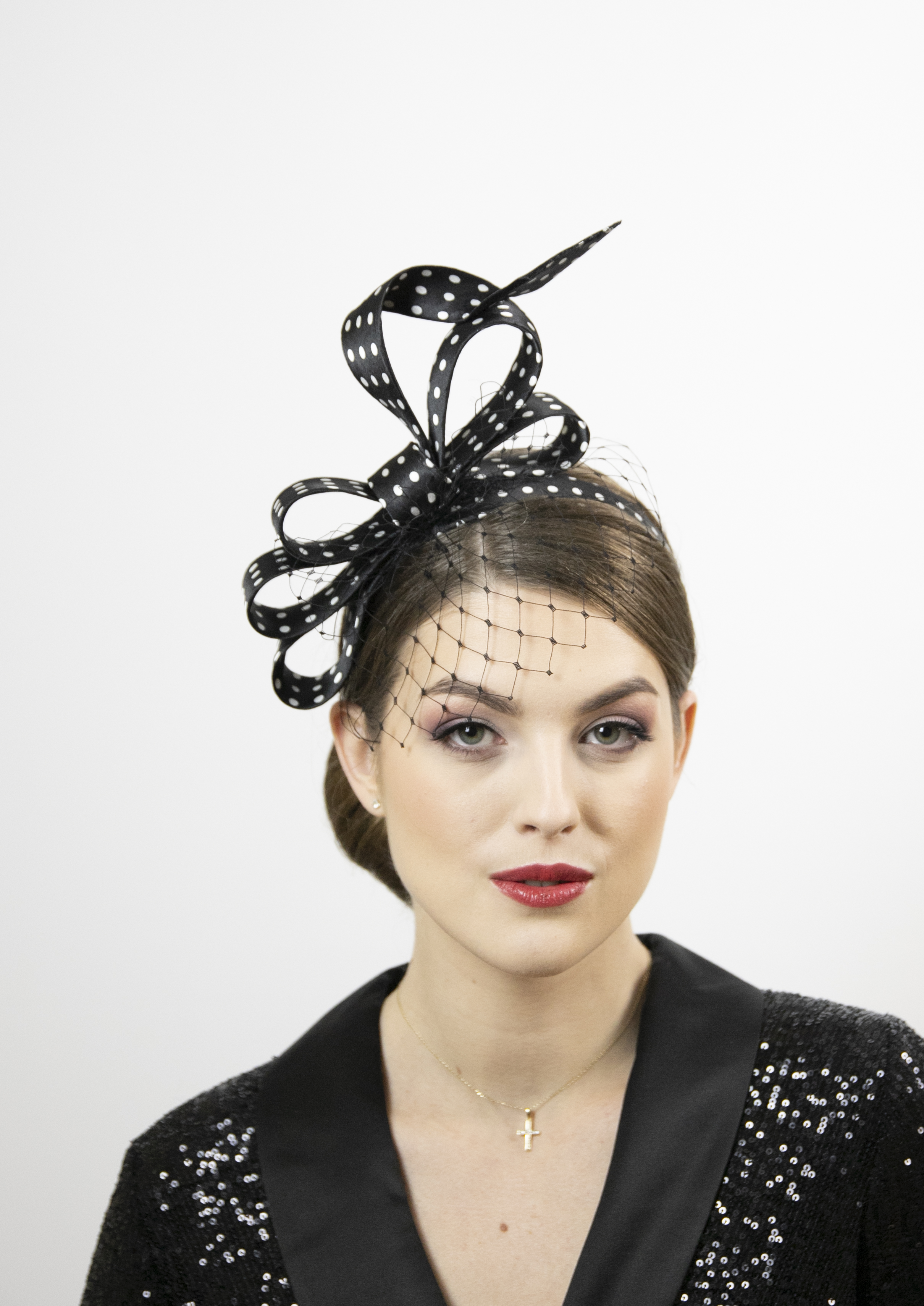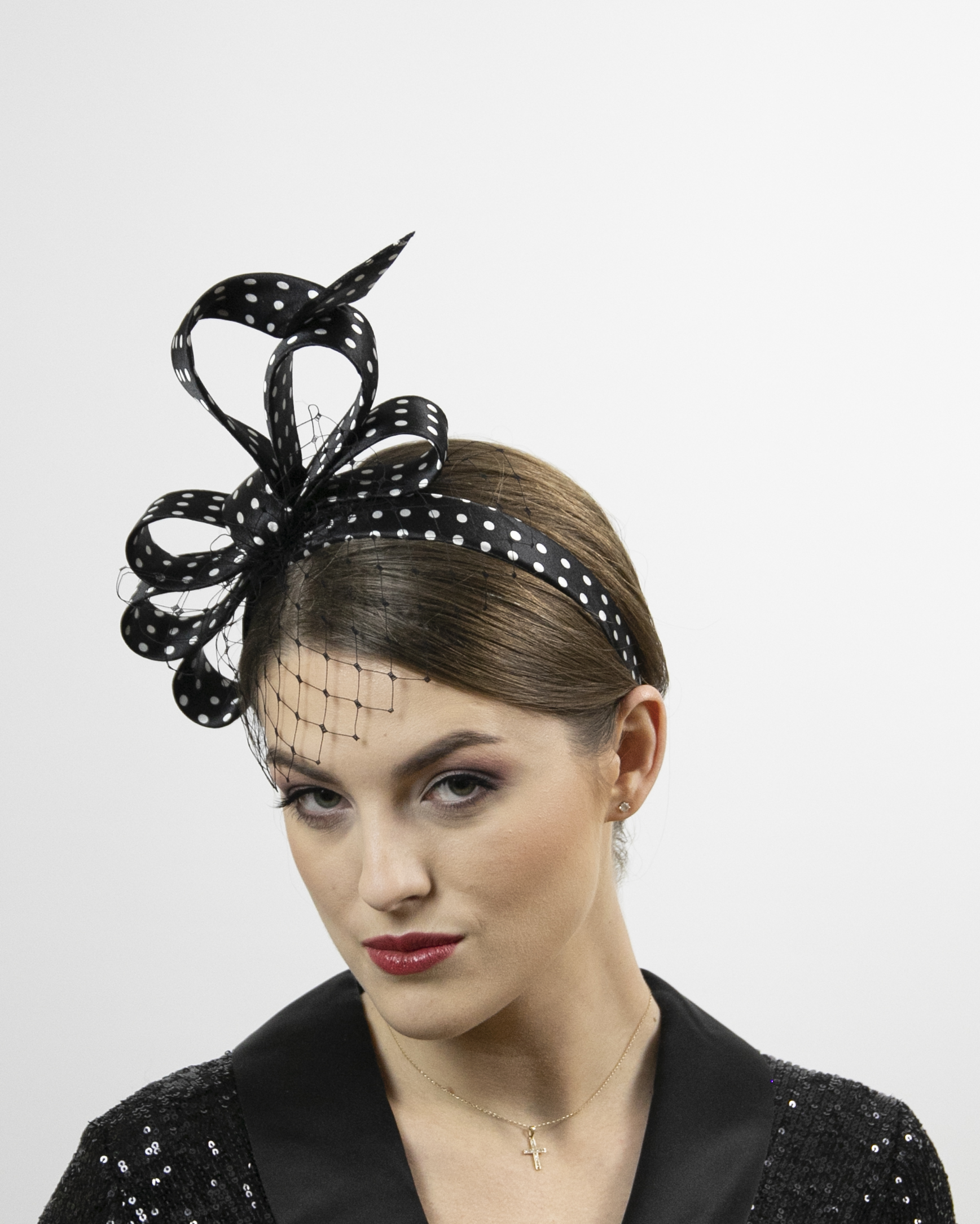 Beautiful, flirty and trendy oversized bow headband-hat from black and white polka dot silk satin fabric.