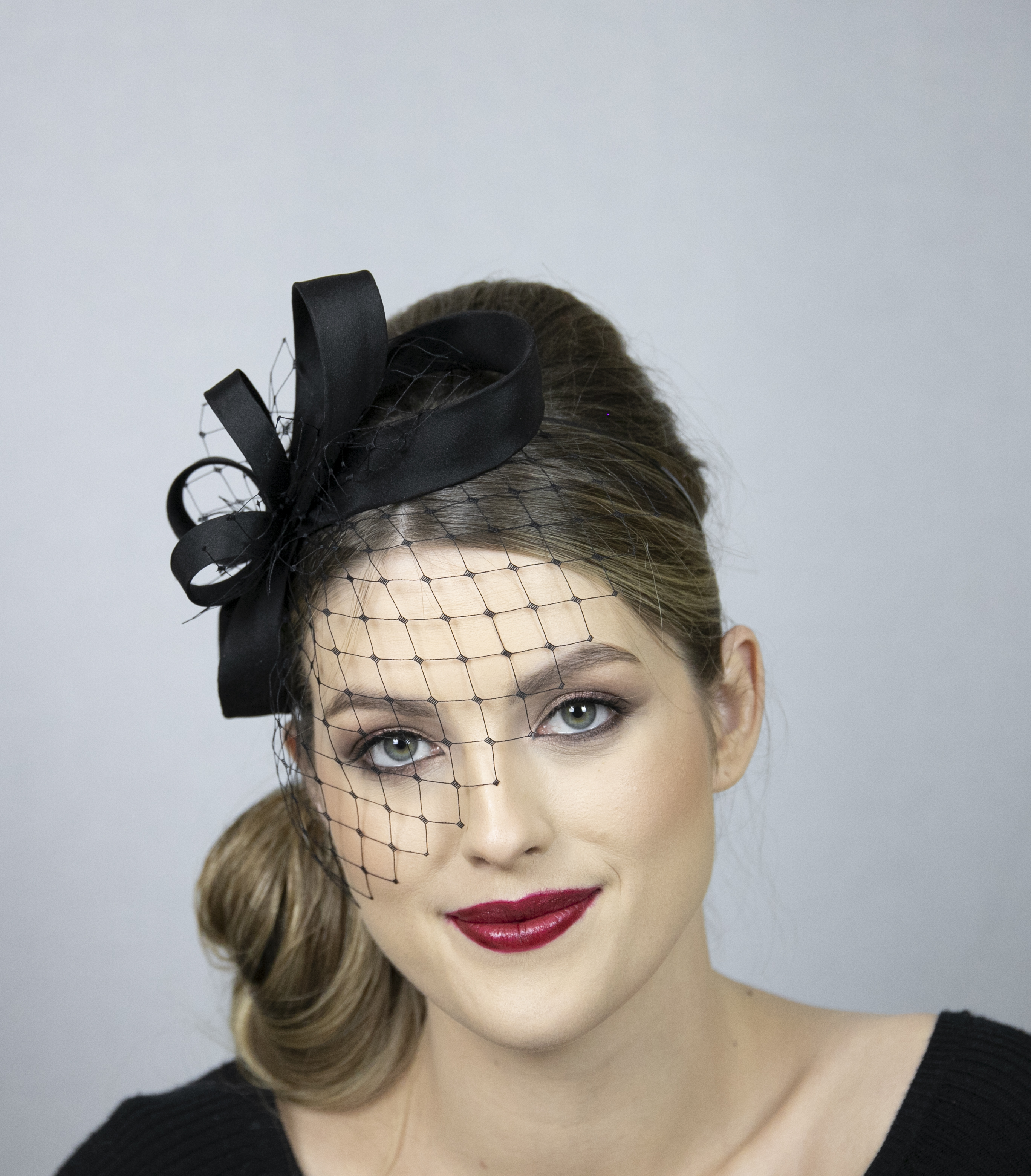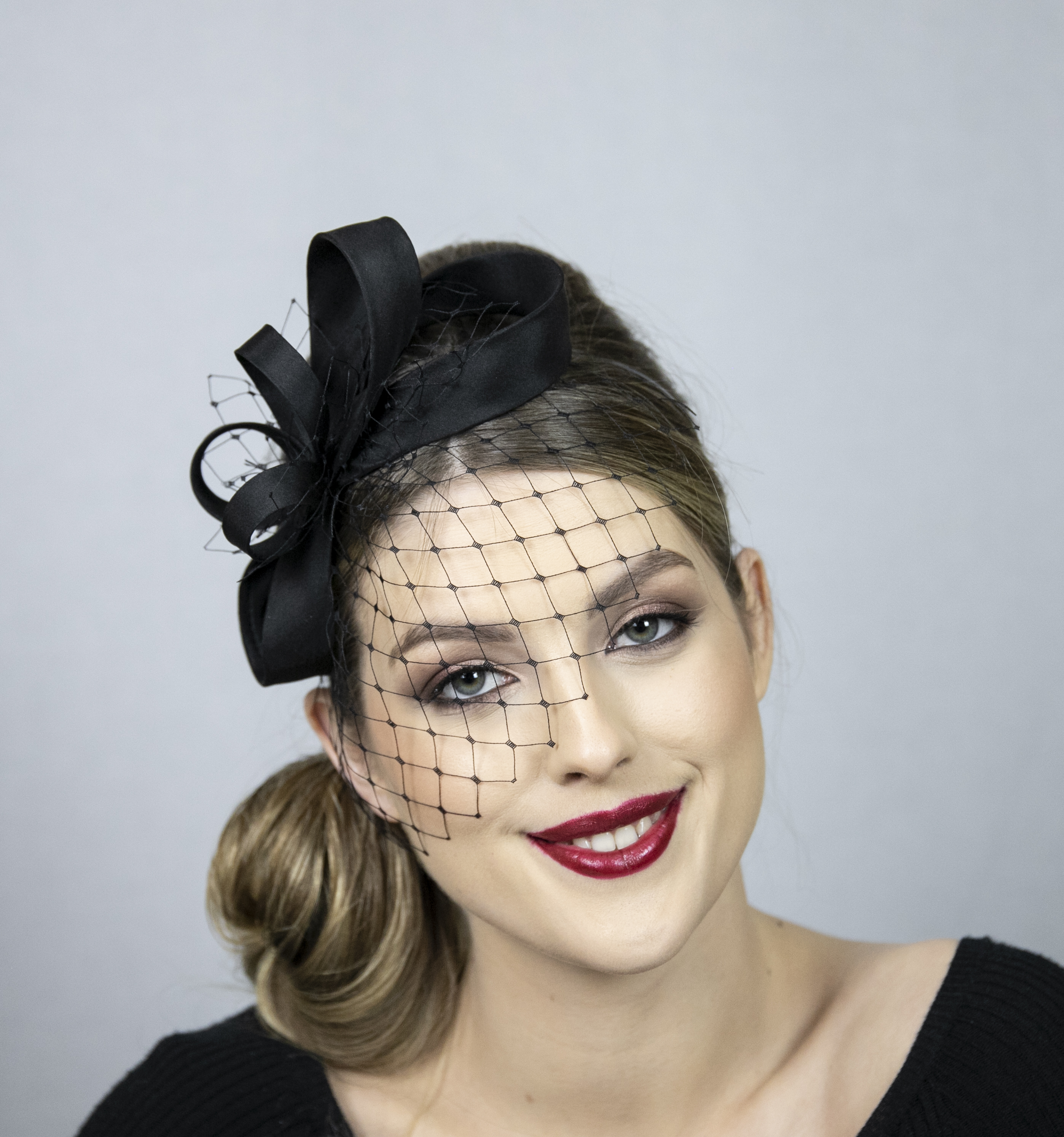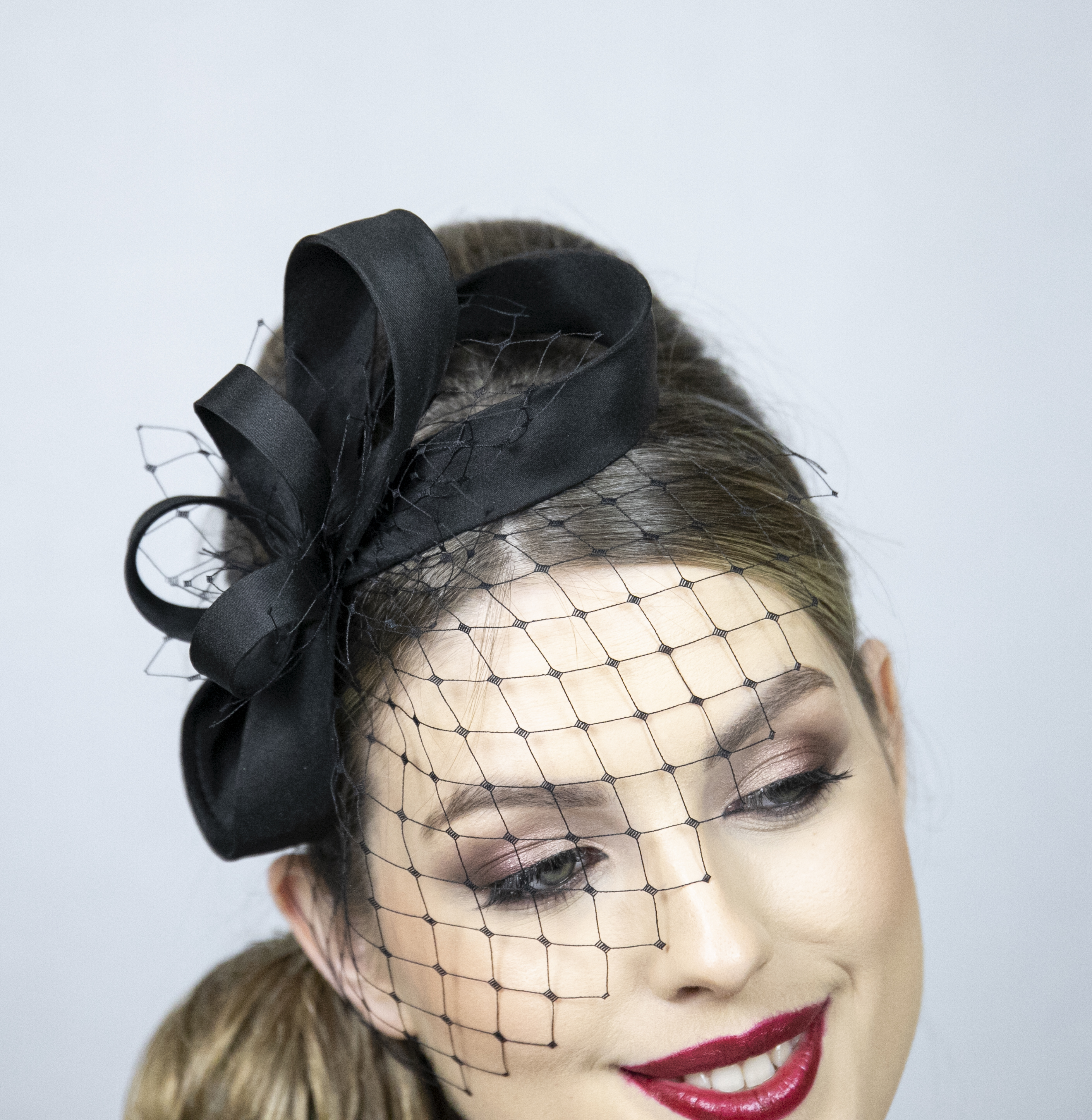 This minimalist, simple and modern fascinator, partriculary because of black silk fabric – allows you to match and wear it at very different occasions and style with multiple different colour and design garments.