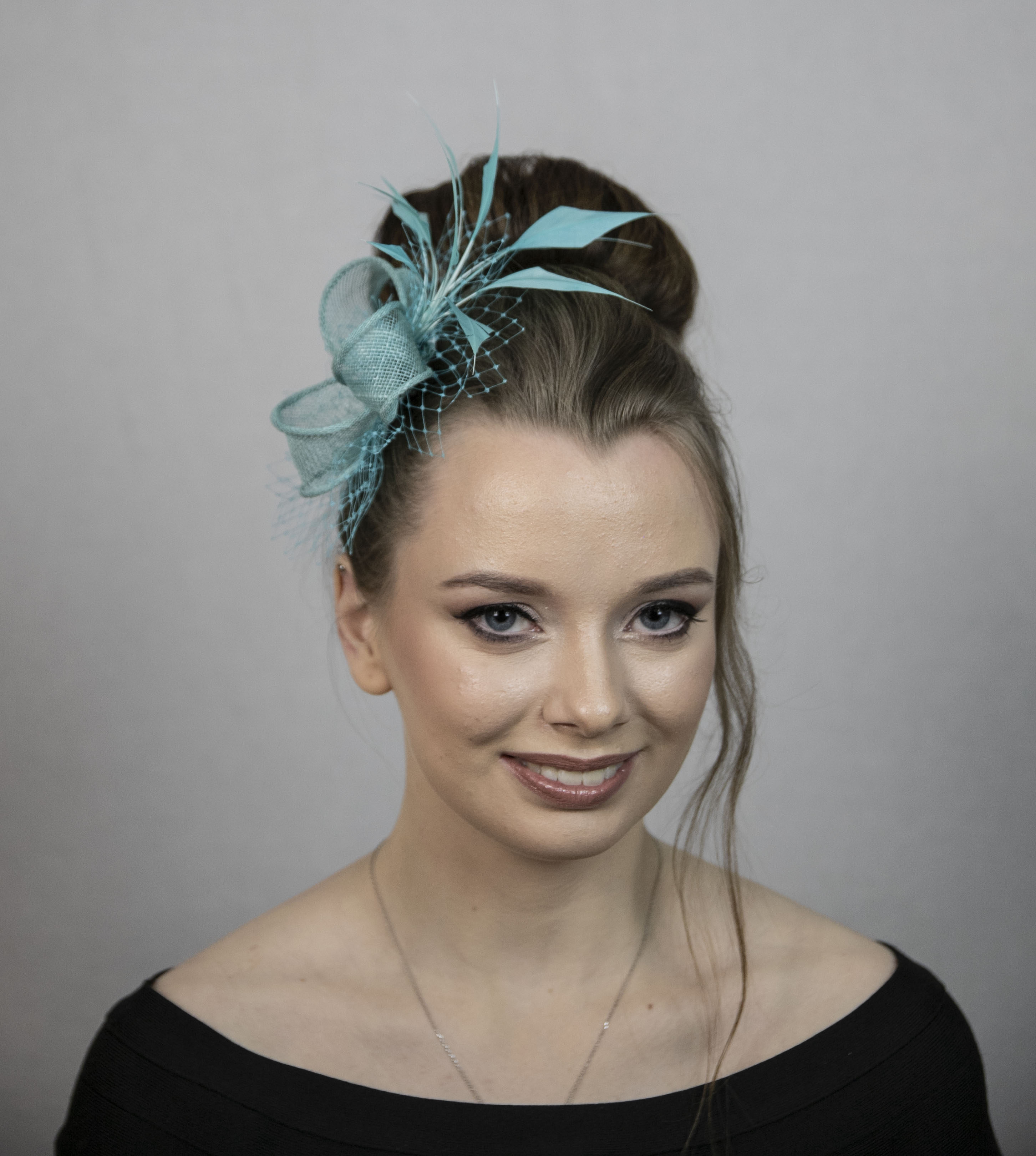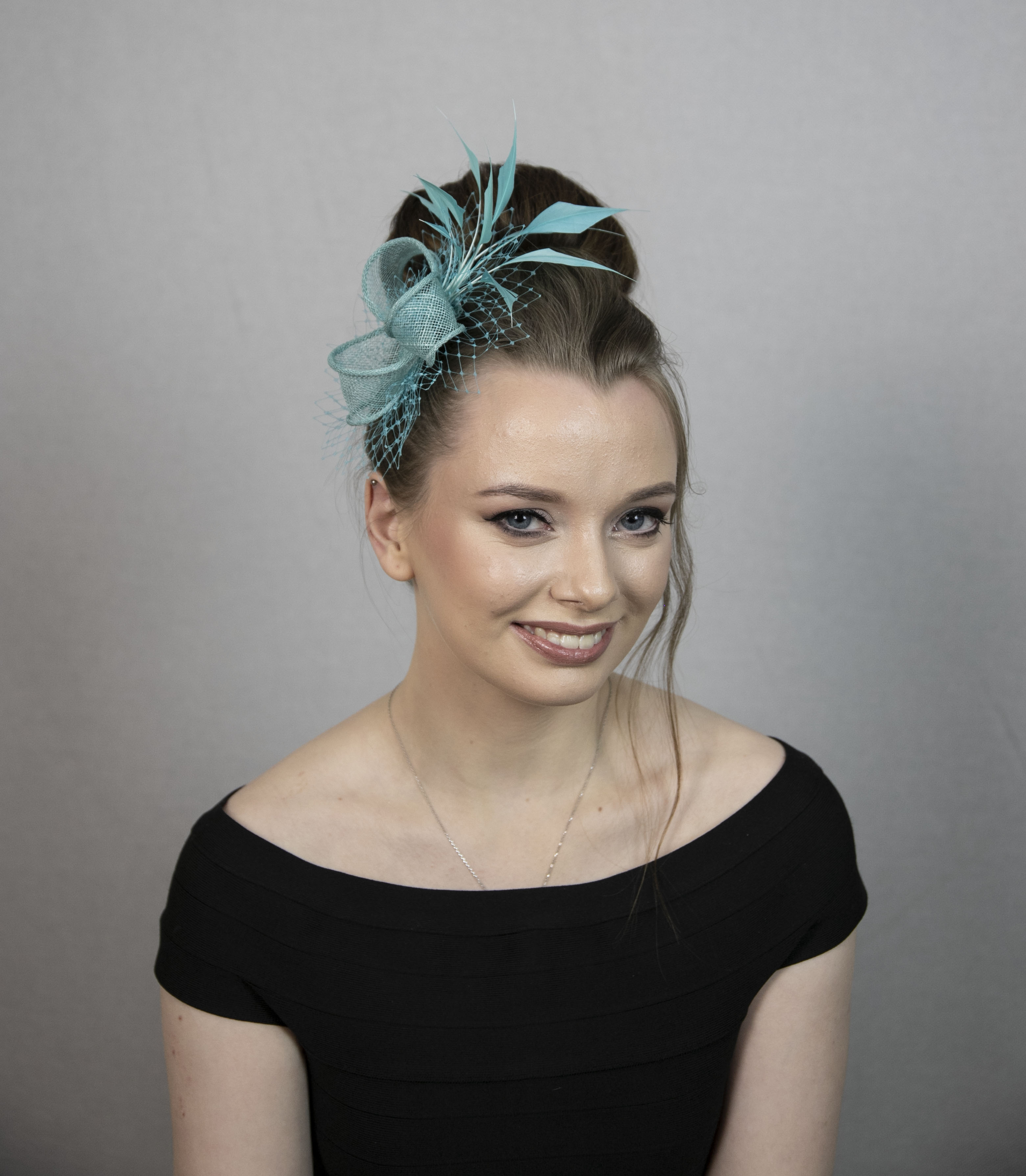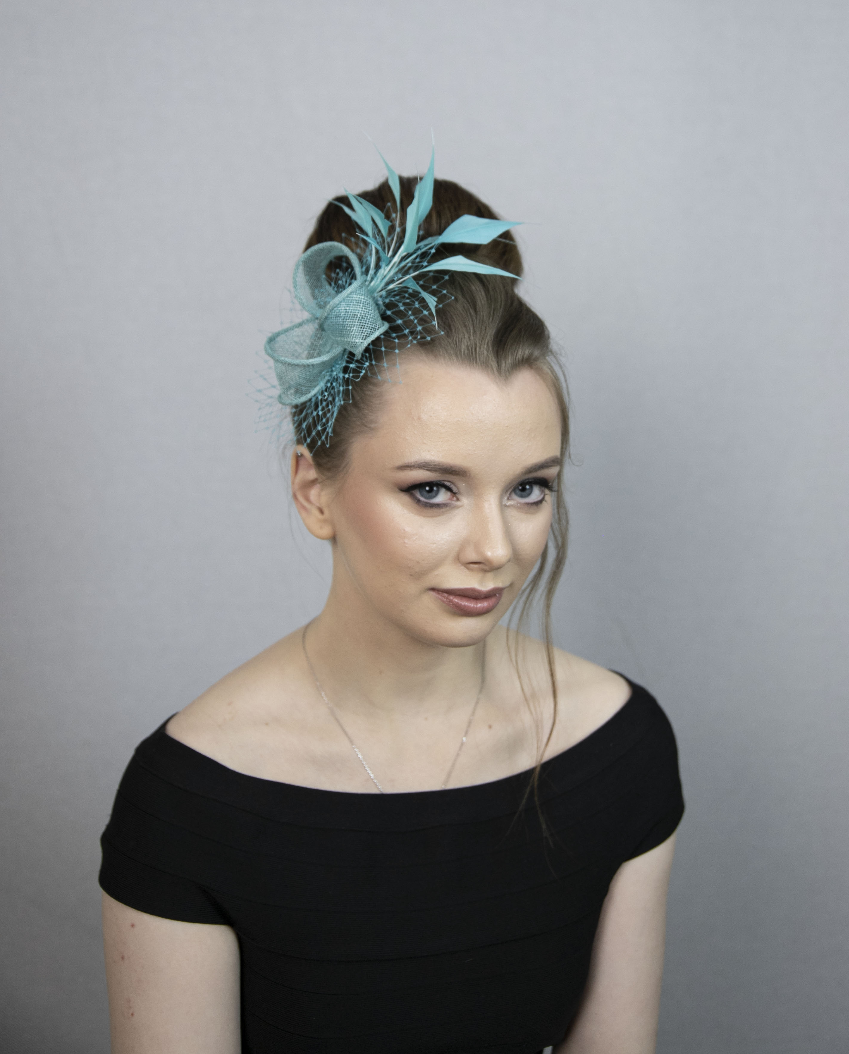 Turquoise green fascinator with beautiful feather crescent.